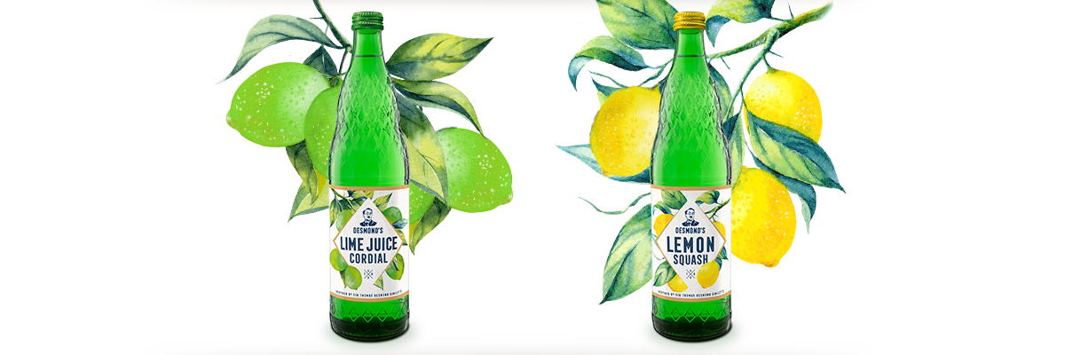 Desmond’s gibt es derzeit in unseren beiden Sorten Lime Juice Cordial mit dem paradiesisch herben Geschmack der Limette und Lemon Squash mit dem fruchtig-frischen Geschmack feiner Zitronen.